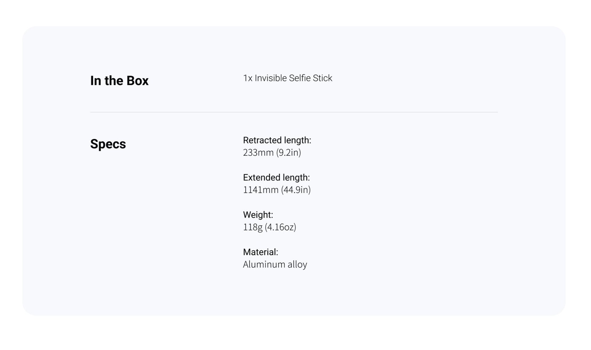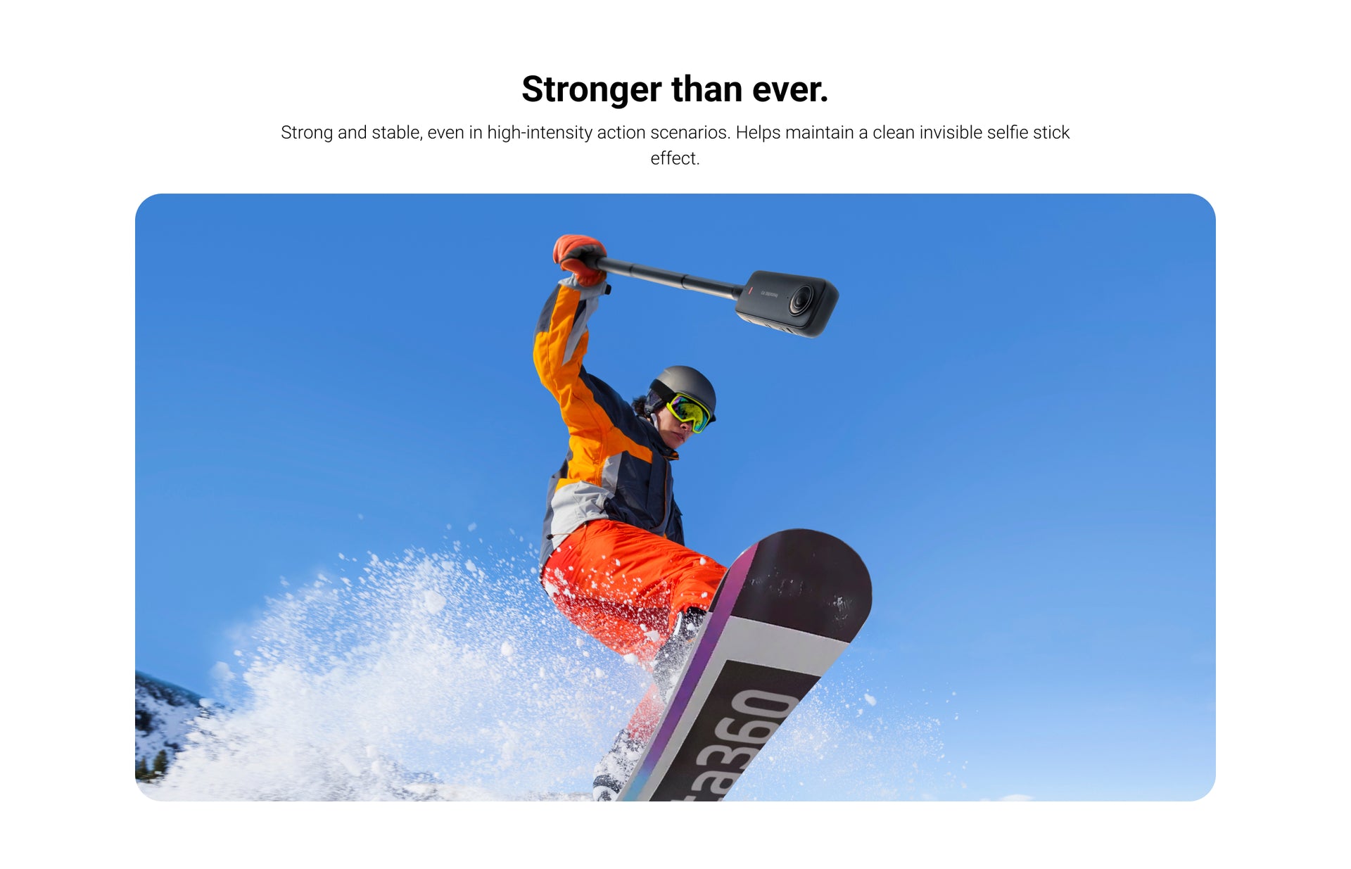 - A lightweight selfie stick perfect for capturing daily life, but not designed for high-speed adventures. For high-intensity sports and action, we recommend the Action Invisible Selfie Stick.