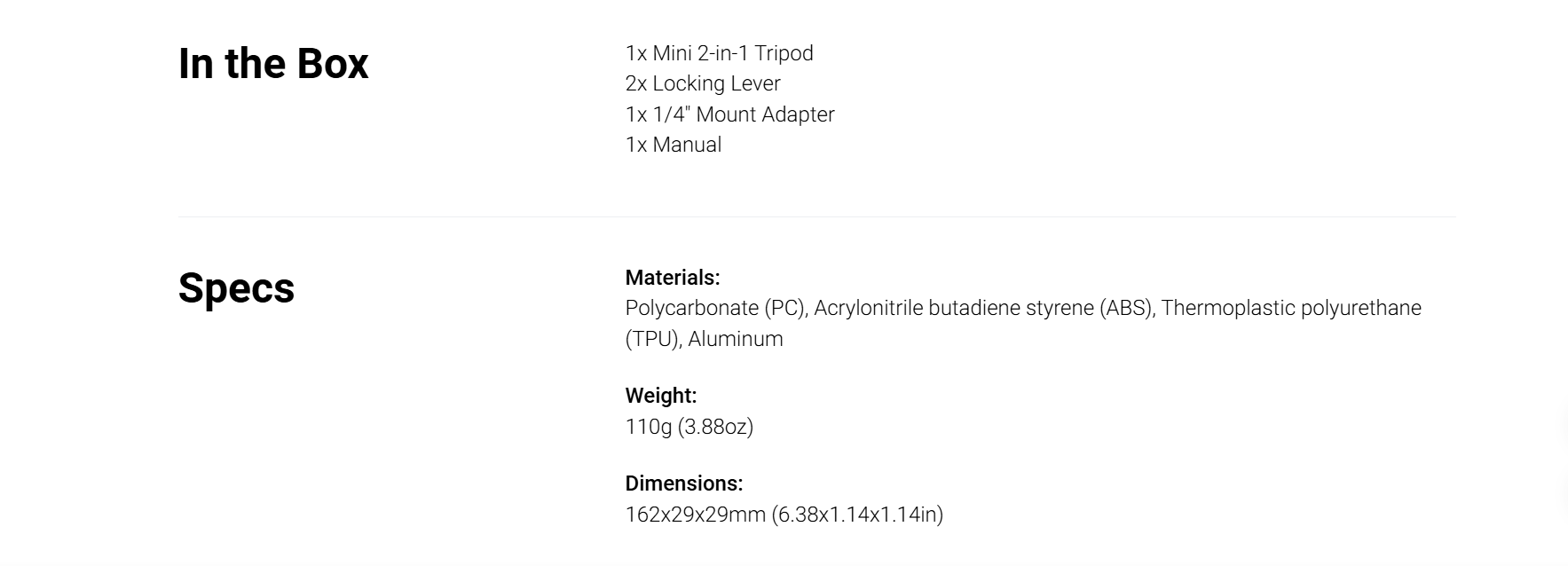 - Includes: 1x Mini 2-in-1 Tripod, 2x Locking Lever, 1x 1/4" Mount Adapter, 1x Manual.